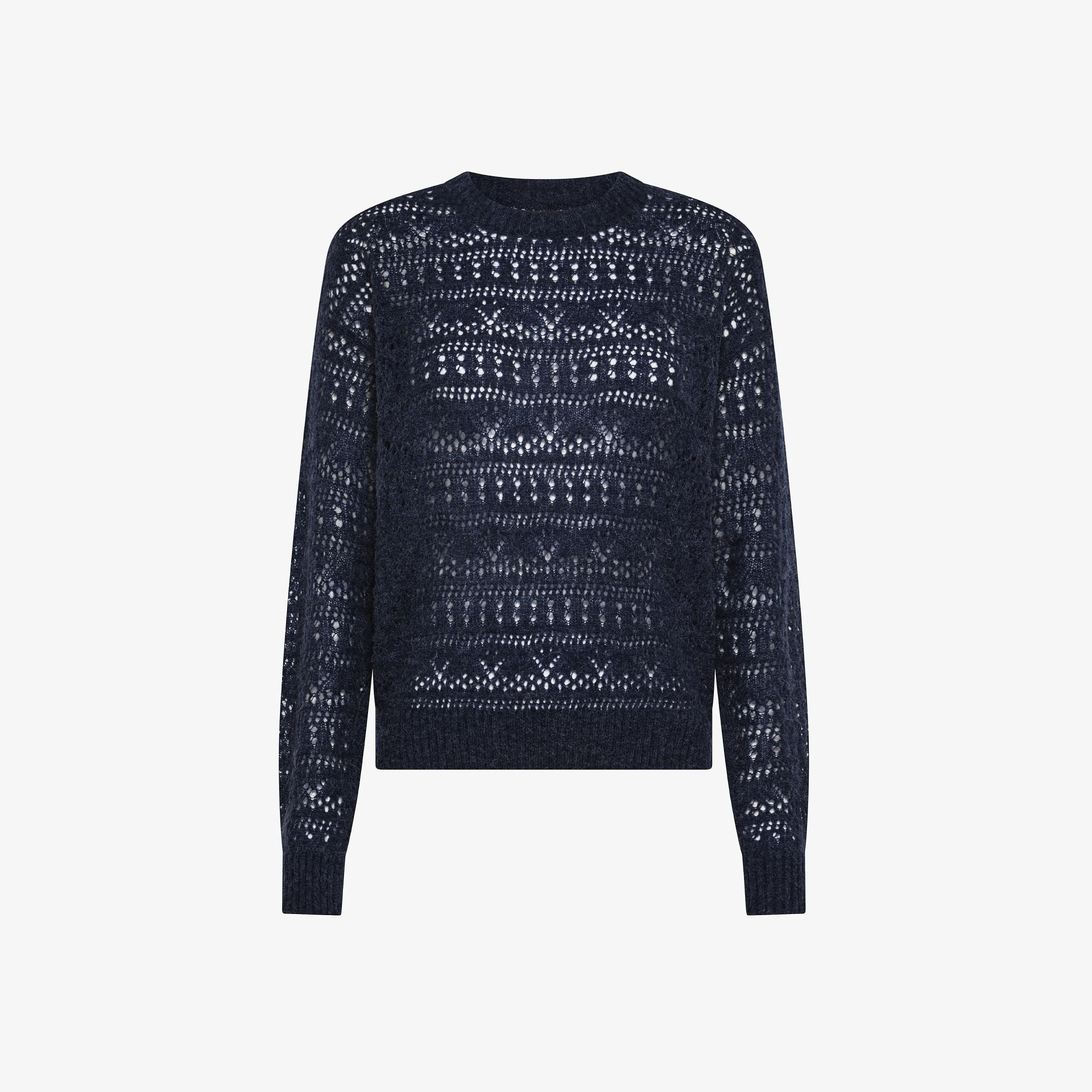 Maglia donna girocollo Art K45224, in filato di misto lana e alpaca con lavorazione a crochet effetto see through. Placchetta in metallo con logo sul retro.